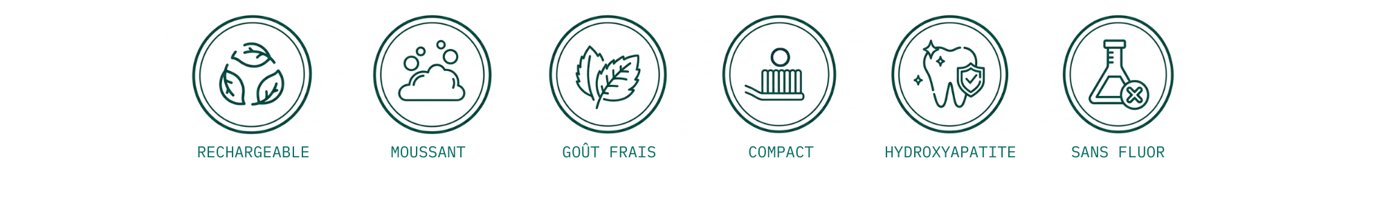 SANS TUBE · NANO-HYDROXYAPATITE · COMPACT · PRATIQUE · RECHARGEABLE · SANS FLUOR · PROPRE · DOSAGE PARFAIT · REMINÉRALISE L'ÉMAIL ·